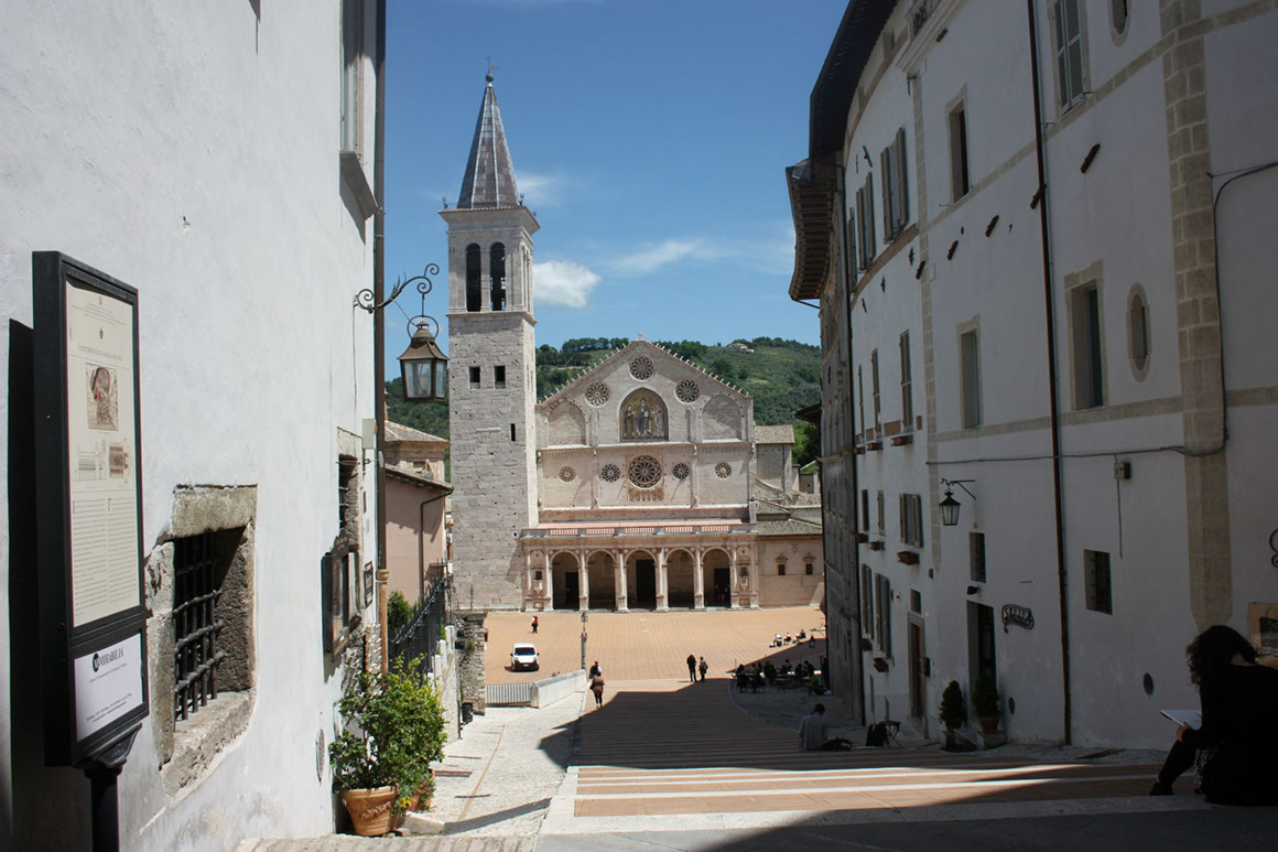 Spoleto, pur mostrando anche nel tessuto urbanistico evidenti influssi di epoca romana, mantiene sostanzialmente intatto un aspetto antico - medioevale, dovuto al periodo in cui fu prima fiorente Ducato longobardo, e poi importante centro dello Stato pontificio. Dallo spazio antistante San Pietro si gode un'ampia vista che abbraccia tutta Spoleto fino al possente Ponte delle Torri, (alto 80 metri e lungo ben 230), il quale collega la Rocca, realizzata a partire dal 1352 per ordine del Cardinale Albornotz, alle pendici del monte che domina la cittadina.